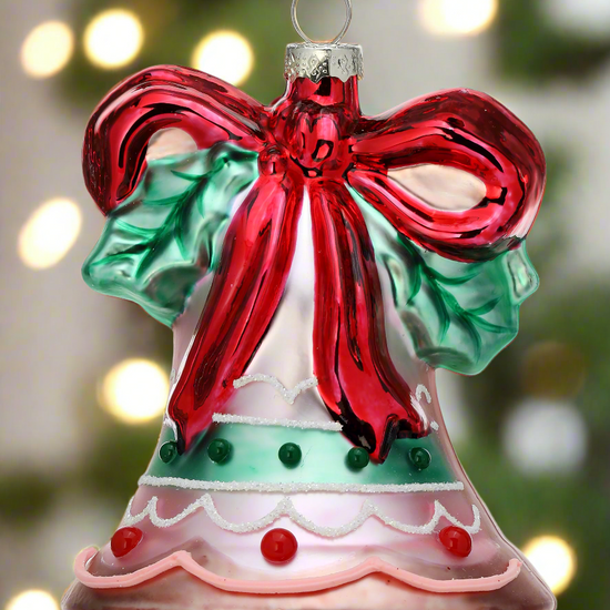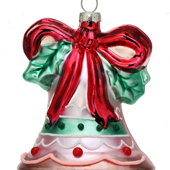 5" Glass holiday sweets bell ornament is a beautiful recreation of midcentury style. Perfect for your retro tree decorating!