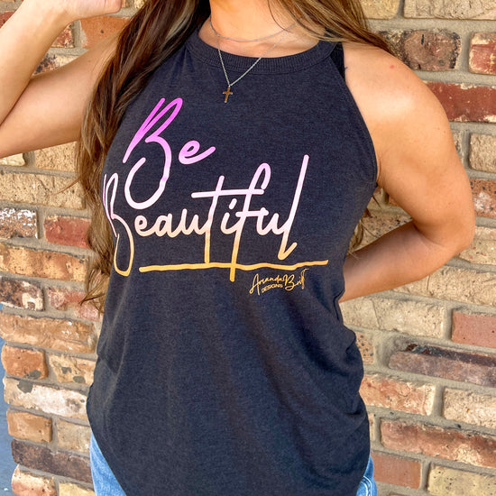 Slip into this dreamy dark gray tank featuring our iconic BE BEAUTIFUL tagline in vibrant sunset hues! This super-soft, ultra-flattering top plays nice with jeans and shorts all year round and has a comfort fit neckline that shows off the prettiest part of your shoulders. Each screen-printed design has its own personality—no two are exactly alike! The perfect mix of comfort and sass for your everyday adventures.