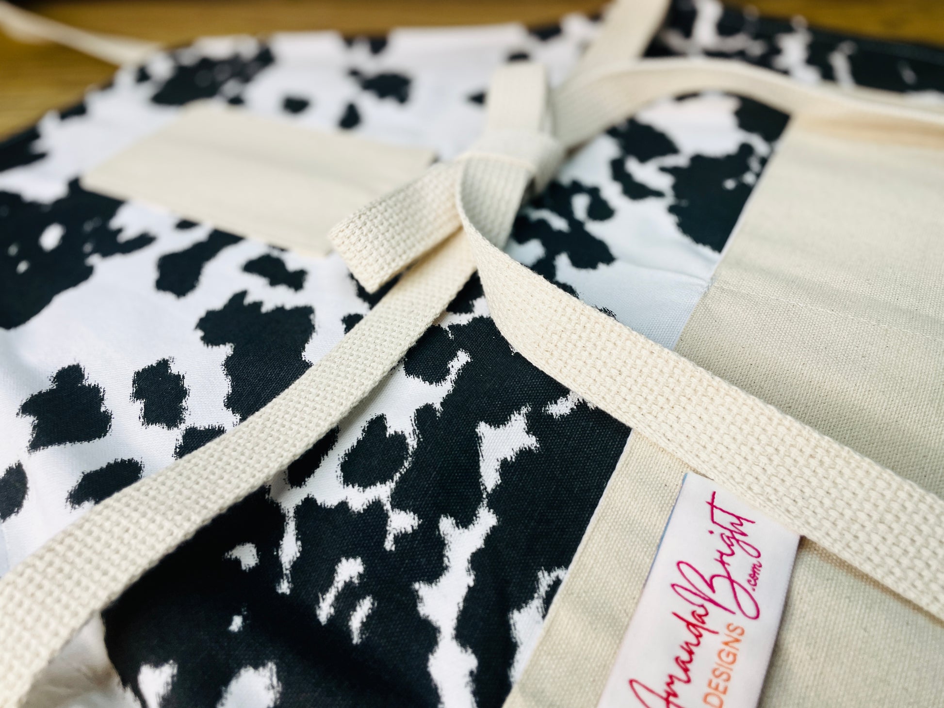 The Cheyenne Apron showcases a stunning black and white cowhide scattered print that'll have you saying "yeehaw" in the kitchen! Whether you're whipping up treats, hosting a shindig, crafting up a storm, or searching for that perfect gift for your cowboy-loving friend, this apron's got you covered. Keep it at home or spruce up your vacation rental with this charming piece! Sporting natural cotton webbing strings and canvas pockets, this 100% cotton beauty is proudly Texas-made, fully lined, and with its extra long strings it's roomy enough to fit up to size 1X. Giddy up and get cooking!