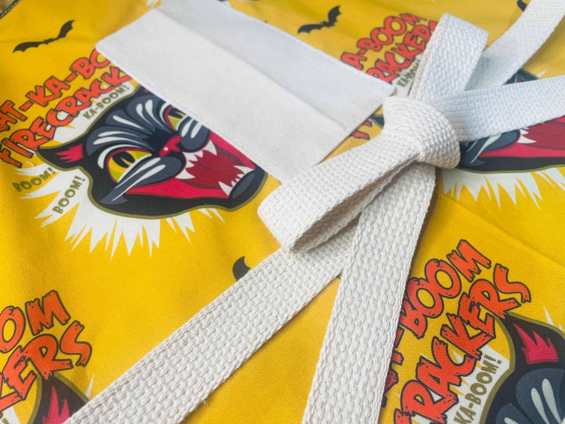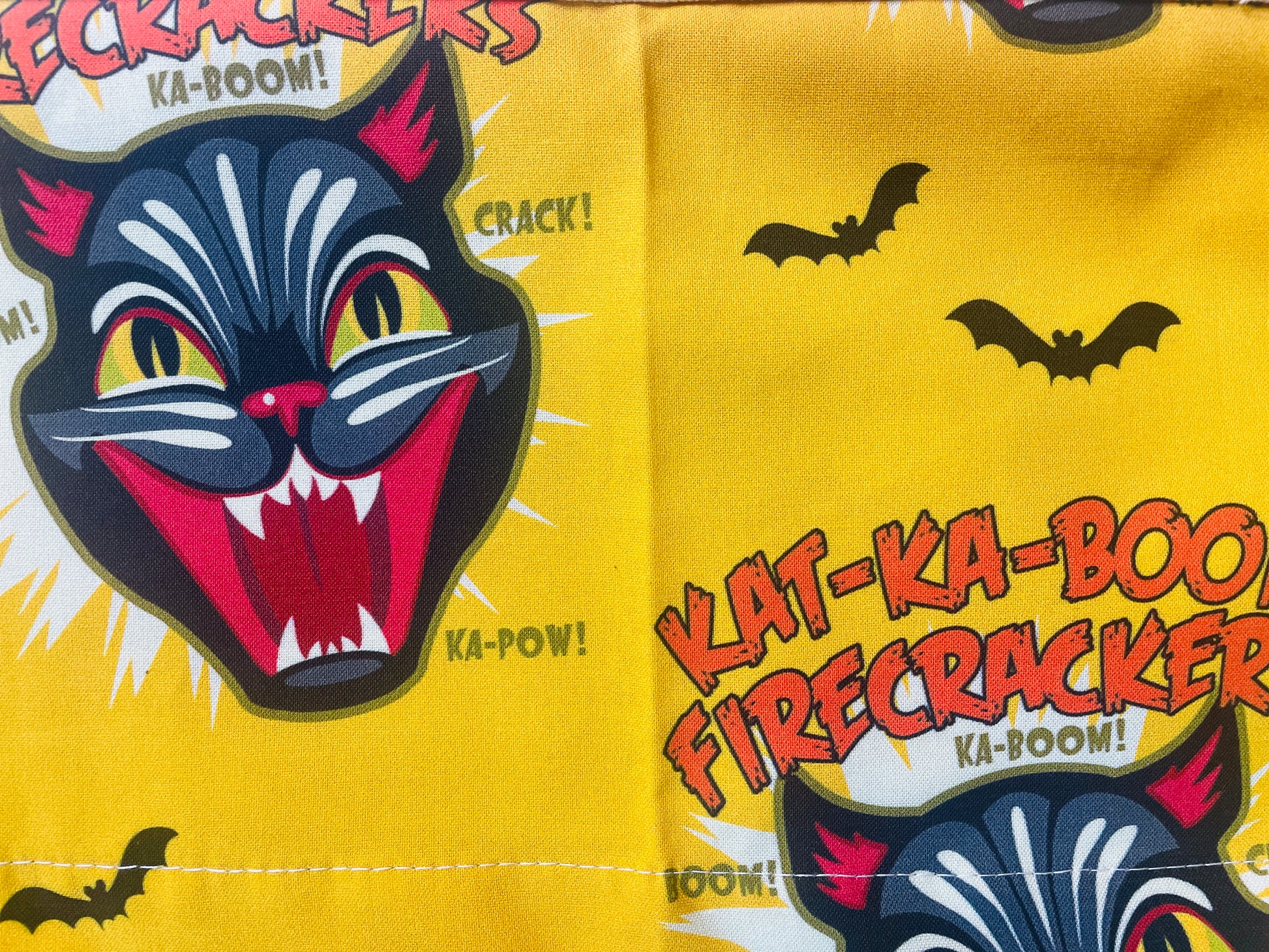 Our Couture Ka-Boom Apron features the famous screaming black cat from Black Cat Fireworks, known as the best fireworks in America! This designer print features the iconic screaming black cat fanged face paired with wording that says "Kat-Ka-Boom Firecrackers" and features bats in signature colors of red and black on a gold background. Perfect for cooking, entertaining or to put you in the holiday mood! This limited-edition petal cotton apron is fully lined and crafted 100% in the USA. Practical and durable, each apron includes sturdy cotton canvas pockets—a top pocket perfect for glasses or spoons, plus spacious bottom pockets for your phone, recipes, or tools. Extra-long webbed cotton ties ensure a comfortable fit up to size 1X, combining authentic style with everyday convenience.