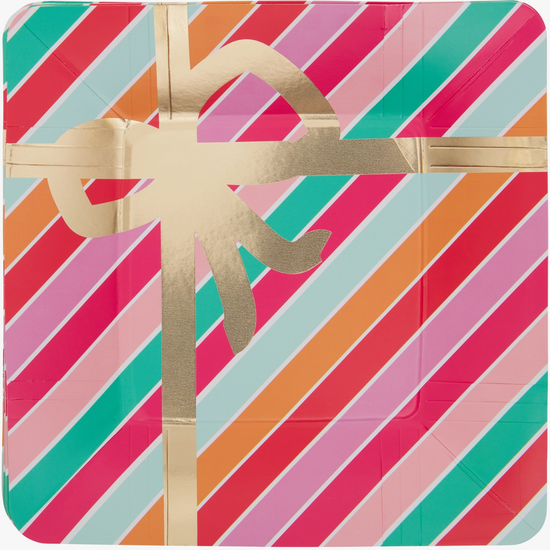 Beautiful striped 8" Merry & Bright Paper Tableware Luncheon Paper Plates are perfect for entertaining when you need plates for charcuterie, appetizers, lunch or dessert! Features a multi-color striped wrapped package with a bright gold foil ribbon and bow. Plates are white on back.