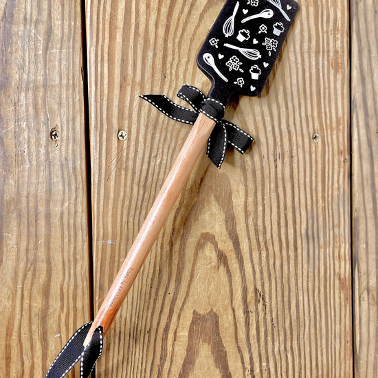 Comes dressed for gifting with a gorgeous black and white bow at the neck and matching ribbon loop for hanging. Features beautiful solid wood handle. Heat resistant up to 375 degrees. Not microwave safe.