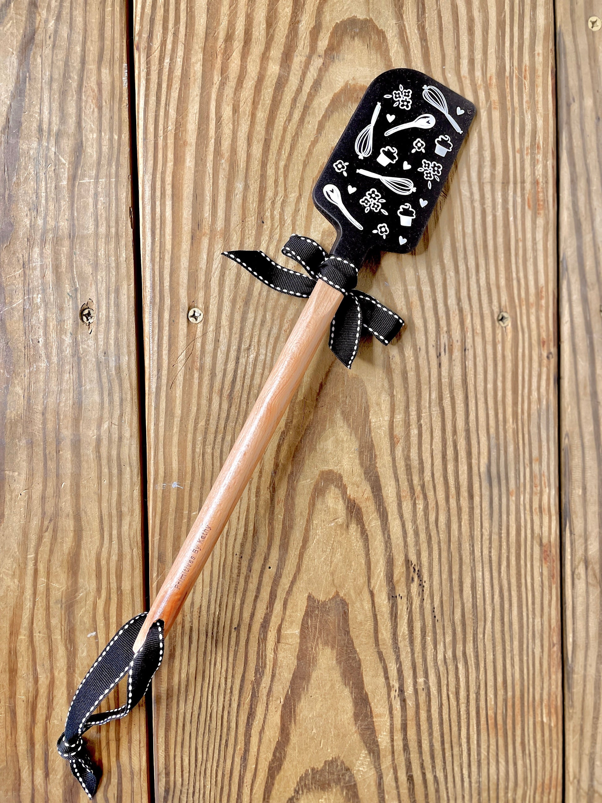 Nana would be so proud to see your kitchen achievements! And this is truly the place "where memories are made and grandchildren are spoiled." This double-sided spatula is very high quality, makes a great birthday, Mother's Day, Christmas or hostess gift combined with our Two Medium Sized Ladies Aprons! Features whisks, cupcakes and spoons on the back.
