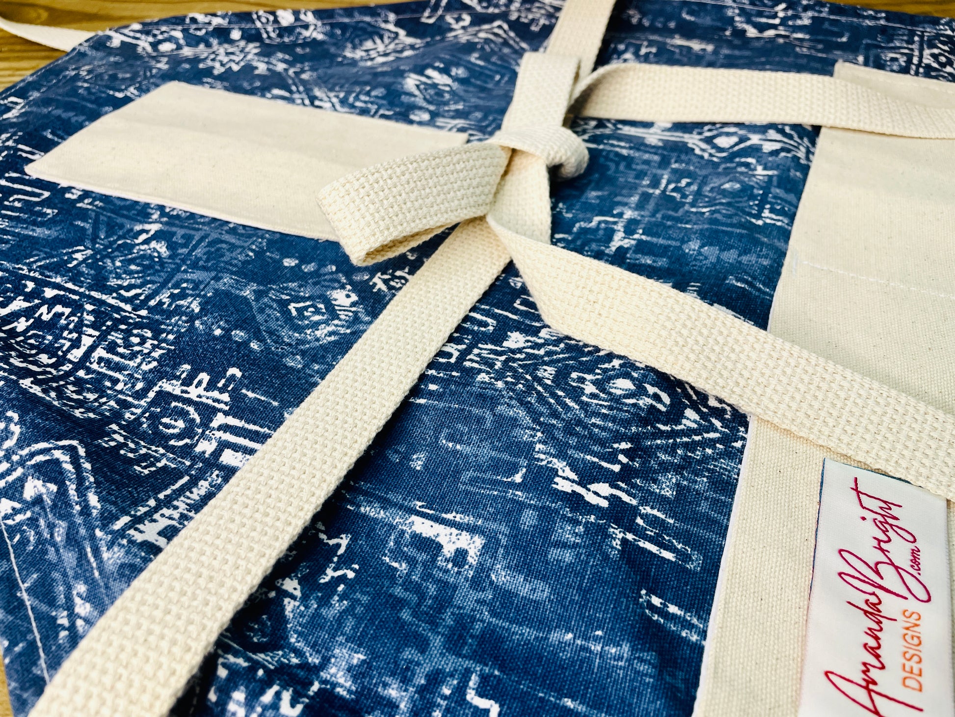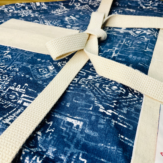 Elevate your western style with the Sierra Apron, an apron inspired by the beautiful prints from the American Southwest. Its captivating faded batik design merges deep denim blue with cream, creating visual interest and style. Whether you're a passionate home chef or someone who values handcrafted pieces, the Sierra Apron brings warmth and character to your culinary space while celebrating artisanal tradition.