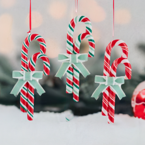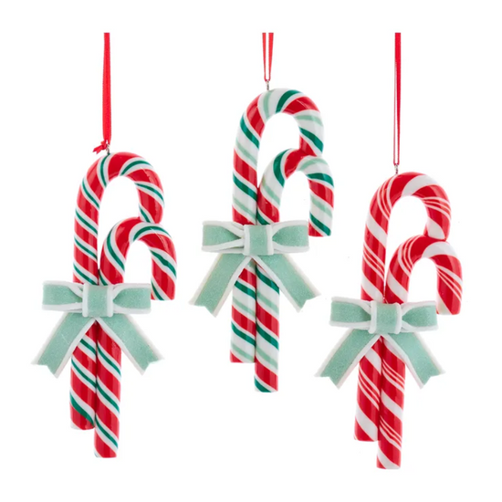 So beautifully made they look real - but these will last you year after year. These striped candy cane pair ornaments from Kurt Adler are just adorable! Each pair of candy canes has a glittered mint green and white bow that looks like candy too. Options in this assortment include three styles: