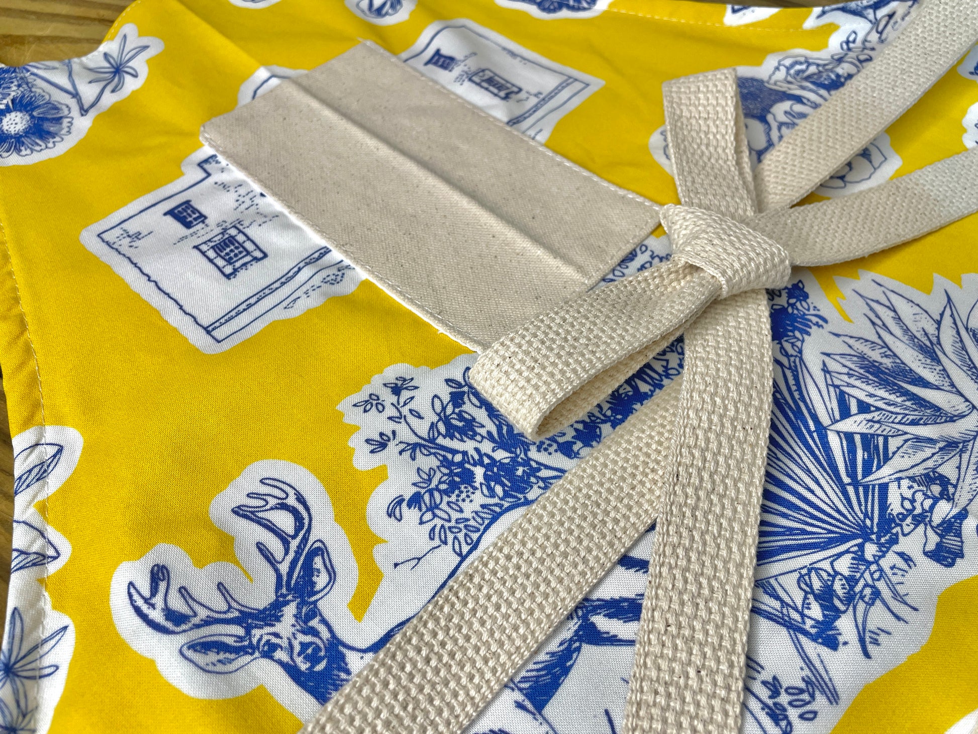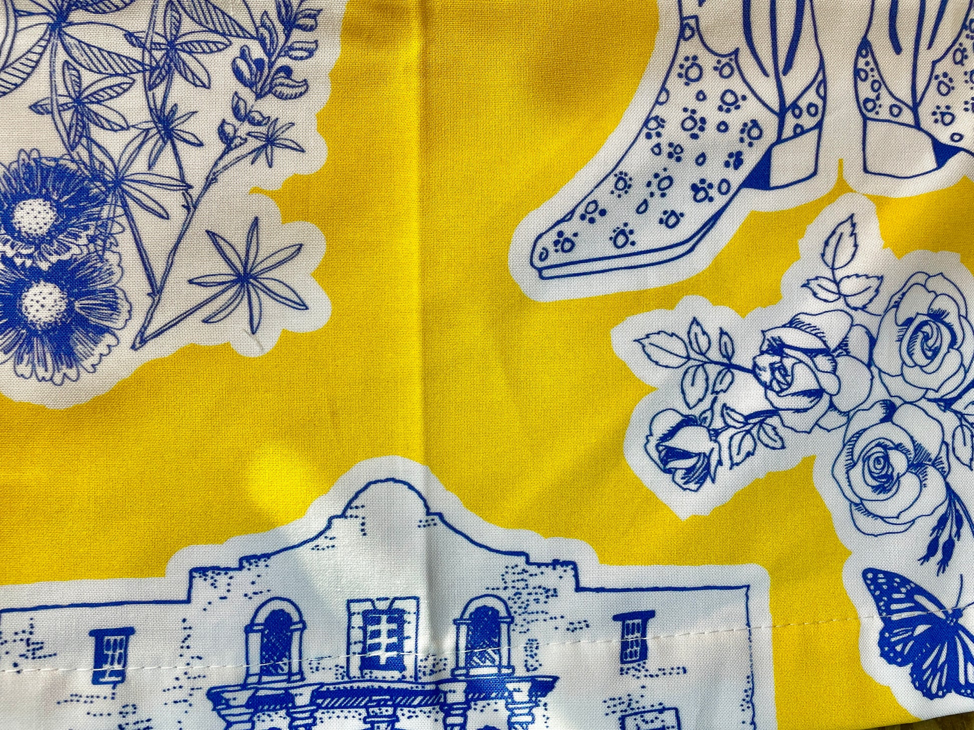 Bring bold Texas spirit to your kitchen, studio, or shop with the Texas Toile Apron in rich gold and navy toile. This exclusive design features iconic motifs from San Antonio and the Hill Country: bluebonnets, cowboy hats, deer, armadillos, cowboy boots, the Riverwalk and The Alamo’s facade, blending history with timeless elegance. Ideal for cooks, bakers, and gardeners who want to showcase their passion for all things Texas!