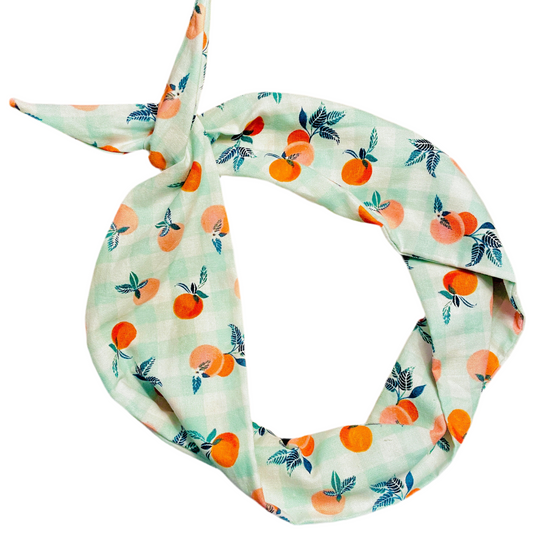 The Peachy Original Tie Headband is perfect for a day at the beach, shopping with the gals or a stroll down the boardwalk. With a playful pattern of summery orange ripe peaches and a mint green buffalo check, you'll be feeling peachy all day long!