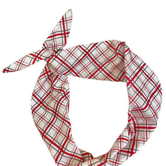 This Original Tie Headband is made from bright white cotton with a red and gray plaid print. The perfect neutral for the fall!